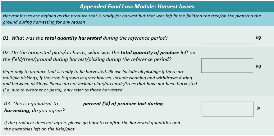 Food losses represent a critical challenge that negatively affects food security, household nutrition, the economy, environmental sustainability and the agri-food system in general. According to the FAO, 13.3% of global food production, equivalent to 1.3 billion tons or 120 kilograms per capita, was lost in 2023 between harvest and retail (FAO, 2025). Accurate information on these losses is essential to guide effective public policies and reduction strategies. In response, countries in Latin America, such as Mexico (ENA 2019), Costa Rica (ENA 2023), and Peru (ENA 2025), have incorporated specific questions on farm-level food losses in their National Agricultural Surveys, while several African countries have, with support from the Global Strategy for Agricultural and Rural Statistics (GSARS), included similar modules in their surveys. However, survey responses tend to underestimate the extent of losses, leading to unreliable data for decision-making. This article focuses on identifying efficient and cost-effective strategies to formulate questions that allow more accurately to capture food losses on the farm, seeking to improve the quality and usefulness of the data collected in annual agricultural surveys. The analysis will include an assessment of the strengths and weaknesses of the different survey formats and strategies, as well as practical recommendations for their implementation in the annual agricultural surveys of Latin America and Africa, considering the cultural, economic and operational differences in these regions. The results of this study will guide national statistical offices, ministries of agriculture and other relevant ministries in designing food loss modules that capture relevant information in a format and standard that can generate good quality data that can inform food loss reduction policies and strategies.