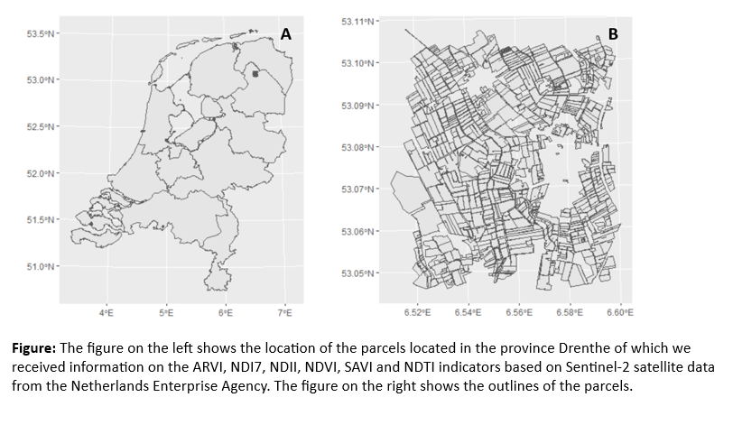 In the Netherlands, farmers have to register their parcels in the Land Parcel Identification System. In this registry the following types of grassland can be registered: a) temporary grassland, b) pasture and meadows, c) rough grazings with agricultural activities and d) rough grazings without agricultural activities (main function nature). Using satellite data, information on these parcels can be obtained. Our goal is to determine if satellite data can be used to discriminate between pasture and meadows (managed permanent grassland) and rough grazings with agricultural activities (non-managed grassland). As a proof of principle, we are currently investigating a set of vegetation indicators based on Sentinel-2 satellite data in a part of the Netherlands (see figure).