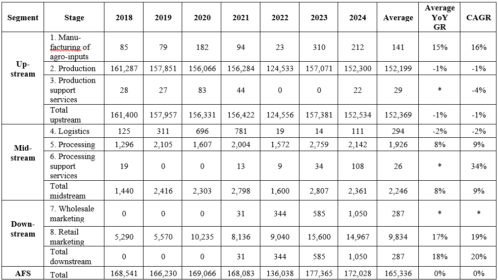 We find that the AFS employs most Bhutanese, but the traditional approach (48%) of assessing agricultural employment underestimates the actual employment in AFS (52%). The growth in jobs outside the AFS (7%) is larger than in the (stagnant) AFS (0%), suggesting that new entries enter into non-AFS jobs and hence the share of AFS employment in total employment declines. Moreover, as the number of AFS jobs in absolute terms remains stable over time, the suggesting that little movement is happening from AFS to non-AFS jobs. Within the AFS, labor remains highly concentrated in upstream production activities and the release of labor off the farm happens slow (an annual growth rate of -1%). We do observe more employment in the crop sector over time while mixed farming is declining over time, which could indicate that more specialization is happening within production. As new employment in the AFS is related to retail activities, the share of jobs in the upstream AFS segment is growing (fast) over time, but starting from a low base. At the same time, just 1% of agrifood jobs are in the AFS midstream segment, and employment in the processing industry is low by any standard.