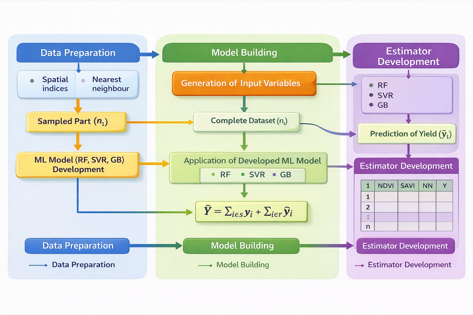 India contributes 7.68% to global agricultural output, with agriculture accounting for a much higher share of the national economy than the global average of 17–18%. Reliable crop yield data is critical for agricultural planning, food security, policy formulation, and resource allocation. In India, the area under cultivation is estimated through complete enumeration, while yields are obtained via sample surveys under the General Crop Estimation Surveys (GCES). These surveys rely on Crop Cutting Experiments (CCEs) conducted annually for major crops using random sampling. Traditionally, 8.5 lakh CCEs are conducted each year, but this number increased to over one crore with the launch of the Pradhan Mantri Fasal Bima Yojana (PMFBY), a yield-based insurance scheme. Although CCEs provide robust field-level data, their scale poses serious logistical and financial challenges. Crop yield is typically spatial in nature and this spatial information can be exploited in order to obtain more precise estimates of crop yield. Recently, the combination of geospatial techniques and machine learning techniques has opened a new arena by providing more efficient and reliable estimates of crop yield. Machine learning algorithms can analyse large datasets from geospatial data and topographical maps to make more precise and timely predictions. Geospatial techniques, which links data to specific locations on Earth, enhances the accuracy of these predictions. Therefore, by integrating advanced computational machine learning techniques with geospatial techniques, crop yield predictions become more precise, and combining these with CCE survey data further enables us to obtain more reliable, and timely yield estimates with reduced number of CCEs which will also bè more cost effective. Therefore, this study develops a novel methodology that integrates geospatial vegetation indices and ML algorithms for crop yield estimation using survey data. ML models are particularly suited for analyzing heterogeneous datasets like satellite imagery. Linking geospatial indices to field survey data enhances reliability and the integration of these approaches increases the accuracy of estimates while reducing the number of CCEs. The empirical study was conducted in Barabanki district, Uttar Pradesh, India. A comprehensive data framework was created by integrating Sentinel-2 multispectral imagery (13 bands, four scenes from February 8, 2018), district and village boundary vector layers prepared using ArcGIS, and ground-based wheat yield data from CCEs conducted during Rabi season. CCE plots with geo-coordinates were sourced from the project “Integrated Sampling Methodology for Crop Yield Estimation Using Remote Sensing, Field Surveys, and Weather Parameters for Crop Insurance,” funded by Ministry of Agriculture and Farmers Welfare. The methodology consists of three major steps input variable generation, model building, and estimator development. Two sets of predictor variables were created. First, nearest neighbour variables, derived from spatial coordinates of CCE plots, used the yield of geographically closest neighbours. Second, vegetation indices included Normalized Difference Vegetation Index (NDVI), Generalised Normalized Difference Vegetation Index (GNDVI), Normalized Difference Red Edge Index (NDRE), Soil Adjusted Vegetation Index (SAVI), and Modified Soil Adjusted Vegetation Index (MSAVI). These variables, combined with observed yield data, produced a comprehensive dataset for ML model training. Three ML algorithms—Random Forest (RF), Support Vector Regression (SVR), and Gradient Boosting (GB)—were employed. The dataset was partitioned into sampled and non-sampled subsets across different proportions (10:90, 20:80, 30:70, 40:60, 50:50) at the village level. The ML models trained the sampled subsets, which then predicted yields for non-sampled part using all predictor variables. Estimator development was based on Royal’s (1970) model-based approach, where population values were viewed as realizations from a stochastic super-population. The finite population was divided into known (sampled) and unknown (non-sampled) components. The sampled part was estimated using conventional GCES methodology, while the nonsampled portion was predicted by ML models trained on sampled data. Final estimates were obtained by pooling sampled and non-sampled parts. Three model-based estimators were developed—RF, SVR, and GB—and compared with the conventional Horvitz–Thompson (HT) estimator. In this design, tehsils were considered as strata, villages were psu, and plots were ssu, with estimators developed at both district and tehsil levels. Performance evaluation included a simulation study in RStudio using custom-developed R scripts. Root Mean Square Error (RMSE) measured prediction accuracy, showing that RMSE declined as sample size increased. GB consistently outperformed RF and SVR across all partitions. Estimator performance was assessed using percentage relative bias (%RB) and percentage relative root mean square error (%RRMSE). All proposed estimators showed very low %RB, indicating negligible bias, while %RRMSE values were consistently lower than those of the HT estimator. Improvements were marked at higher sample sizes, with the GB-based estimator demonstrating the greatest efficiency. The proposed framework improves accuracy and offers the possibility of reducing number of CCEs under PMFBY. In conclusion, this study establishes a robust framework for combining geospatial and ML techniques for more reliable and timely crop yield estimation. This approach can transform agricultural statistics in India, supporting efficient crop insurance, and sustainable food security strategies.