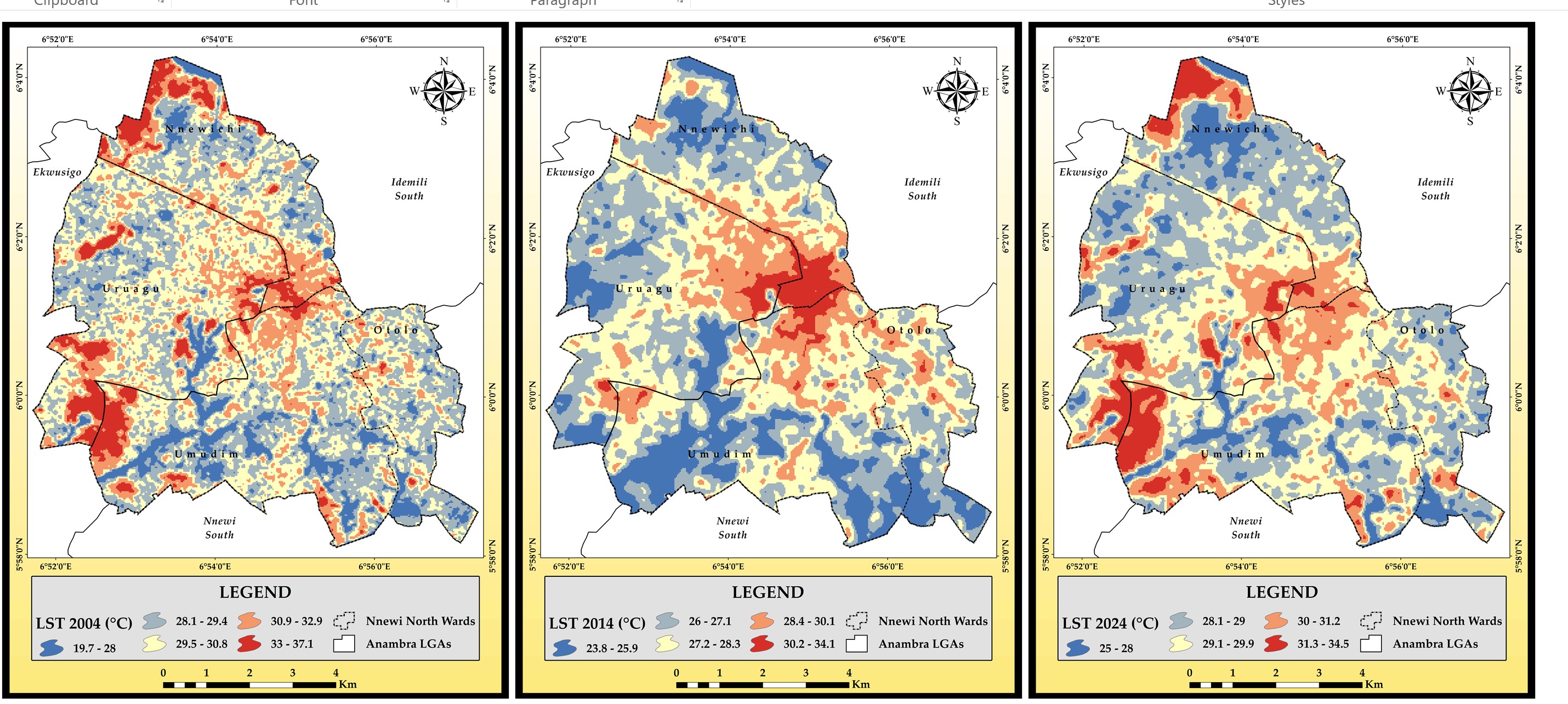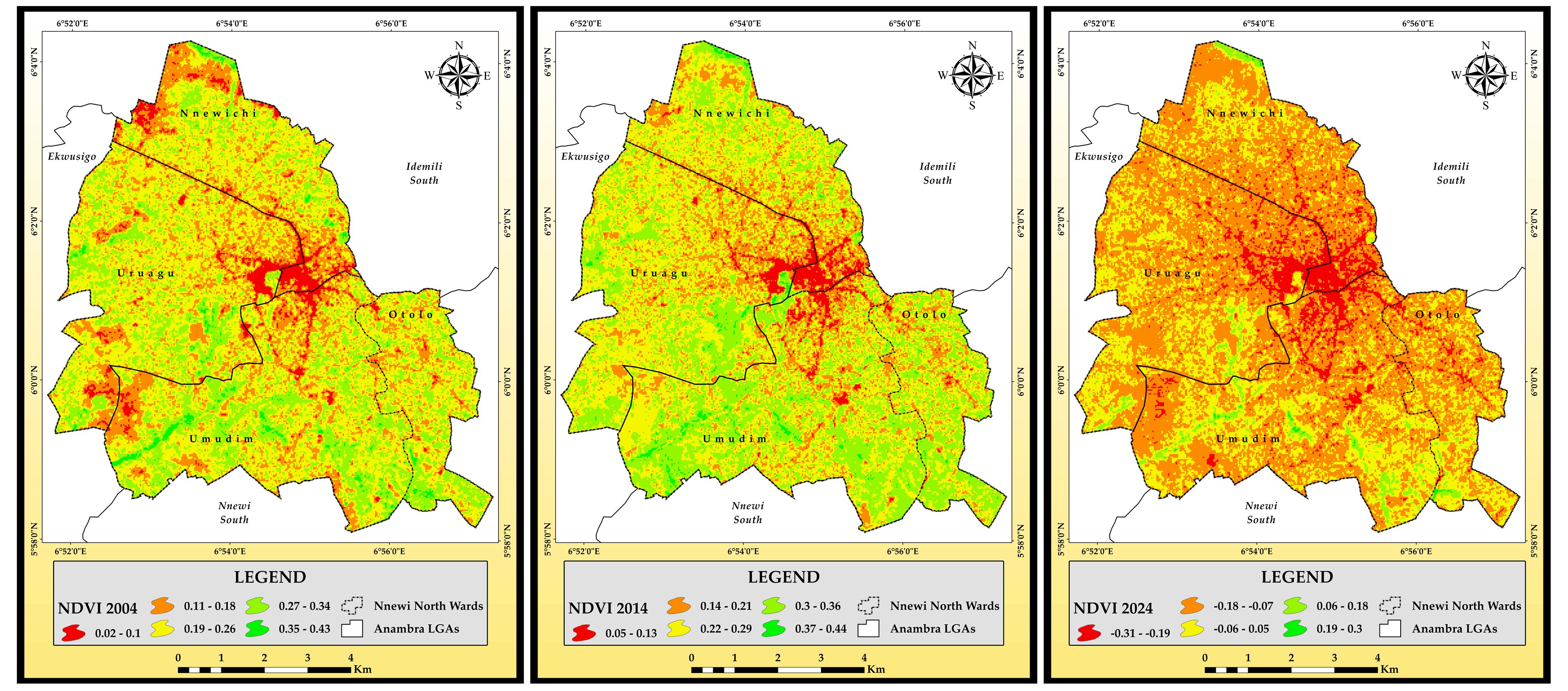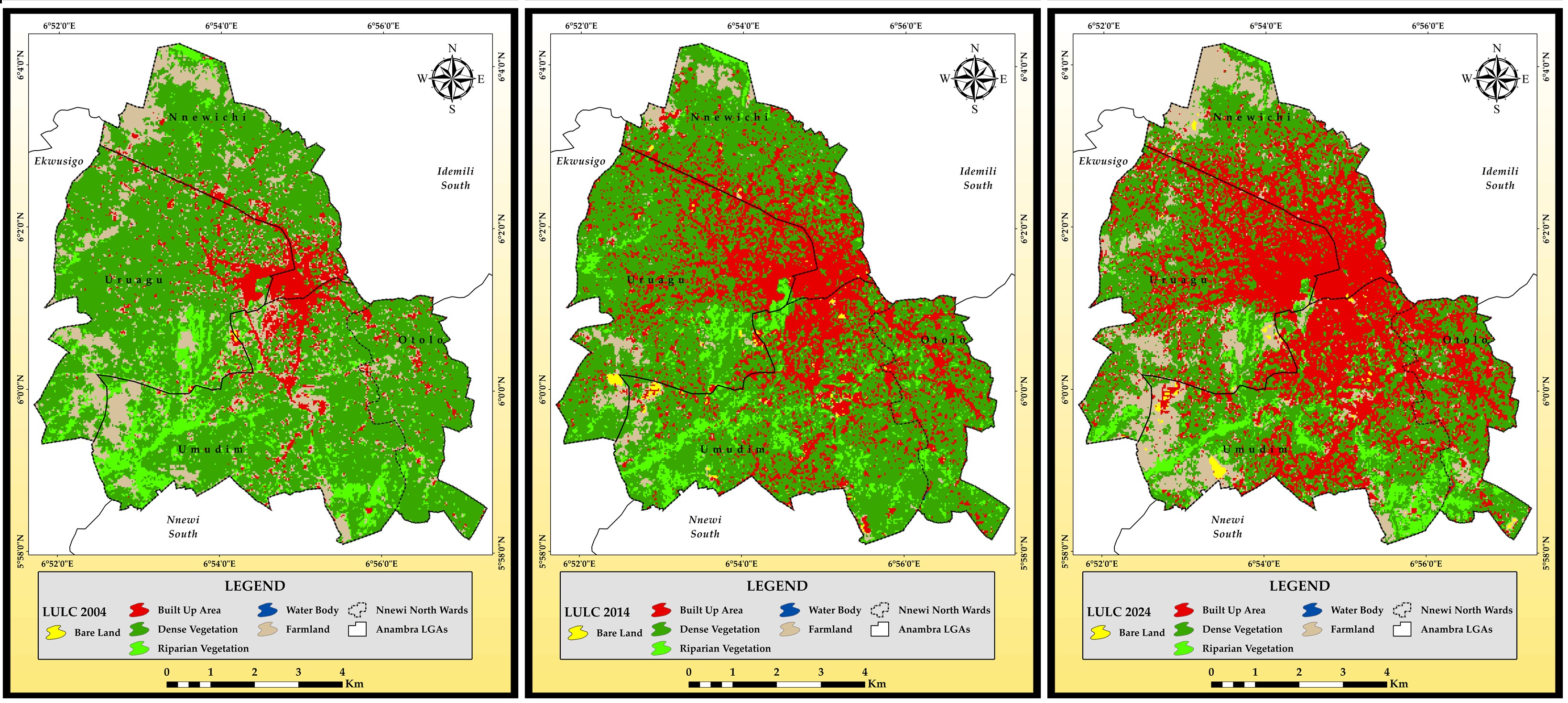 This study presents a geospatial assessment of land use/land cover (LULC) change, vegetation dynamics, and land surface temperature (LST) trends in Nnewi North Local Government Area, Southeastern Nigeria, from 2004 to 2024. Cloud-free Landsat 7 ETM+ and Landsat 8 OLI/TIRS imagery were processed to derive Normalized Difference Vegetation Index (NDVI), retrieve LST via the mono-window algorithm, and perform supervised LULC classification using ArcGIS.Six major LULC classes were identified: Water Bodies, Built-up Areas, Bare Land, Dense Vegetation, Farmland, and Riparian Vegetation. Between 2004 and 2024, built-up areas increased dramatically from 5.96% to 25.22%, while dense vegetation declined from 45.79% to 30.32%. NDVI values revealed a steady degradation in vegetation health, with mean NDVI dropping from 0.25 in 2004 to 0.10 in 2024. In parallel, mean LST values rose from 27.2°C in 2004 to 29.8°C in 2024, underscoring the urban heat impact of vegetation loss.This study highlights the interconnected effects of land cover transformation and urban expansion on local microclimate. By integrating satellite imagery with geospatial techniques, the research offers evidence-based insights to guide sustainable land management, urban planning, and environmental policy in Sub-Saharan Africa.