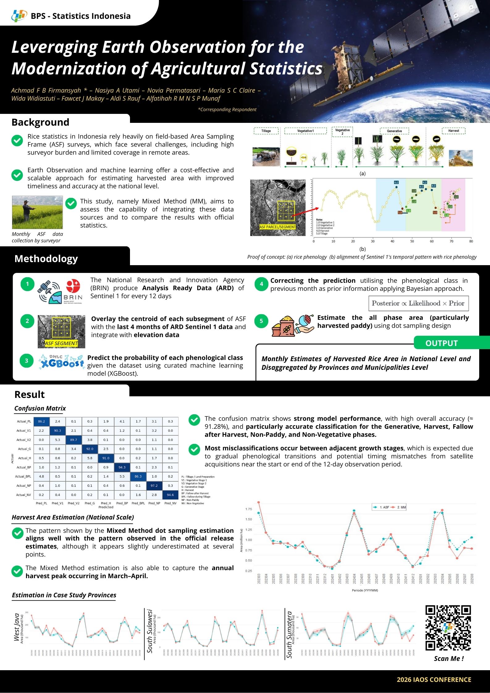 This study develops a mixed method that integrates satellite data and field survey information. Sentinel-1 radar imagery is combined with ASF observations to train a machine learning model (XGBoost) to classify rice growth stages. To ensure realistic and consistent temporal patterns, a Bayesian post-processing step is applied to correct implausible transitions between phenological stages. The predicted growth stages are then aggregated using the standard ASF sampling design to produce harvest area estimates, along with measures of uncertainty such as standard error (SE) and relative standard error (RSE), following official statistical procedures.