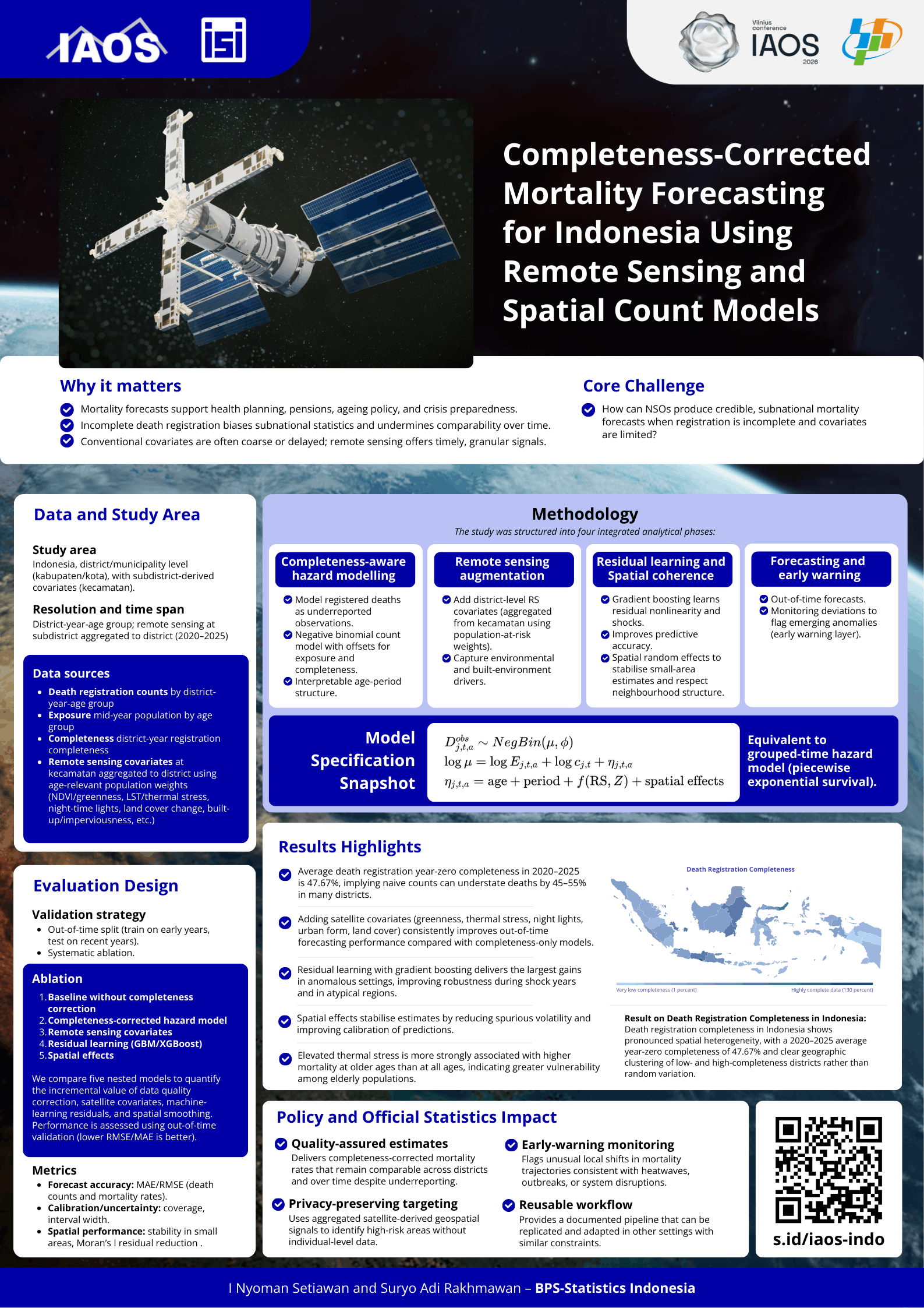 Mortality forecasting is central to evidence-based planning for public health, social protection, and population ageing. However, in many national statistical systems including Indonesia, its operational value is often constrained by two structural limitations: (i) death registration that remains incomplete and temporally varying across areas, and (ii) the scarcity of timely, spatially granular covariates that can support subnational modelling and early warning. In the context of the data revolution, this study develops a scalable, quality-aware framework that integrates satellite-derived remote sensing signals with demographic count modelling to produce completeness-corrected mortality estimates, enhance forecasting performance, and generate actionable geospatial risk surfaces for policy targeting.